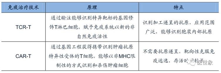 ① TCR-T :TCR-T通過轉導嵌合抗原受體(融合抗原結合域及T細胞信號結構域)或者TCR α/β異二聚體,來提高特異性識別腫瘤相關抗原(Tumor Associated Antigen, TAA)的TCR的親和力和戰(zhàn)斗力,使T淋巴細胞能夠重新高效的識別靶細胞。通過輸注能夠識別特異靶標的基因修飾T淋巴細胞,賦予免疫系統(tǒng)以新的非自然免疫活性。這種方法除了能像細胞毒性化療和靶向治療快速殺滅腫瘤外,還避免了疫苗和T淋巴細胞檢查點療法的延遲效應。TCR基因治療臨床有效率相對較低,尋找有效的腫瘤靶抗原克隆高親和性的TCR受體以及優(yōu)化TCR的轉化效率是目前的研究重點。