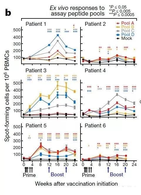 這個圖檢測的是注射到病人體內的4個混合免疫多肽庫產生的免疫細胞效價,疫苗有效的病人1,3,4,5效價最低都有200,而很快復發的病人2和6,效價沒有超過100。還是那句話,敵眾我寡的時候基本上打不贏。