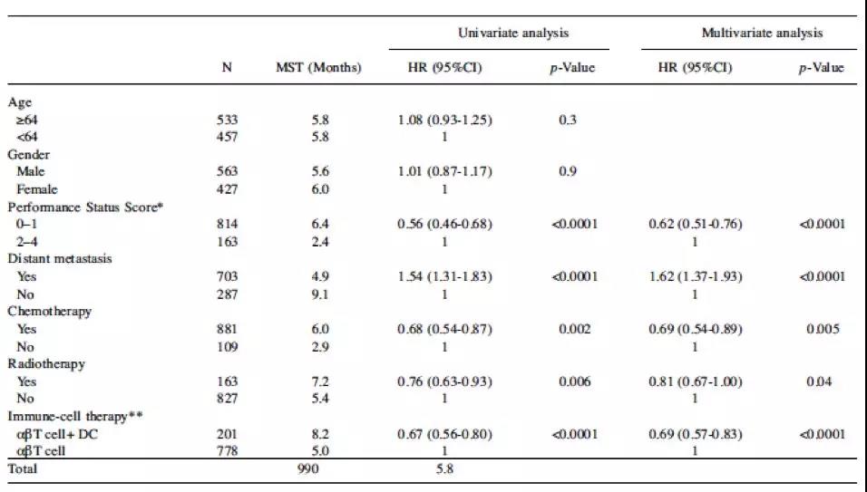 ?免疫細胞療法中αβT細胞療法和樹突狀細胞疫苗聯合,與單獨用αβT細胞療法組別對比,統計結果有臨床意義(P<0.0001)。