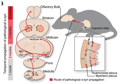 帕金森病致病在小鼠體內(nèi)的傳播途徑。圖片來源:Ted Dawson