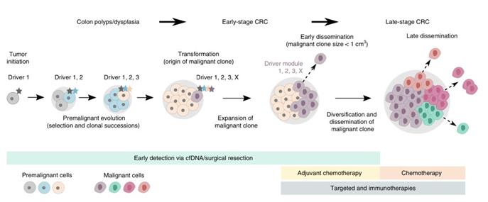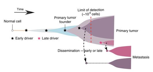雖然目前腸癌轉移的主流模型也是腫瘤經過一系列的克隆進化之后,到晚期才轉移。但是也有數據證明,腸癌也是“天生的壞種”,在腫瘤誕生的早期就具備了轉移的能力。