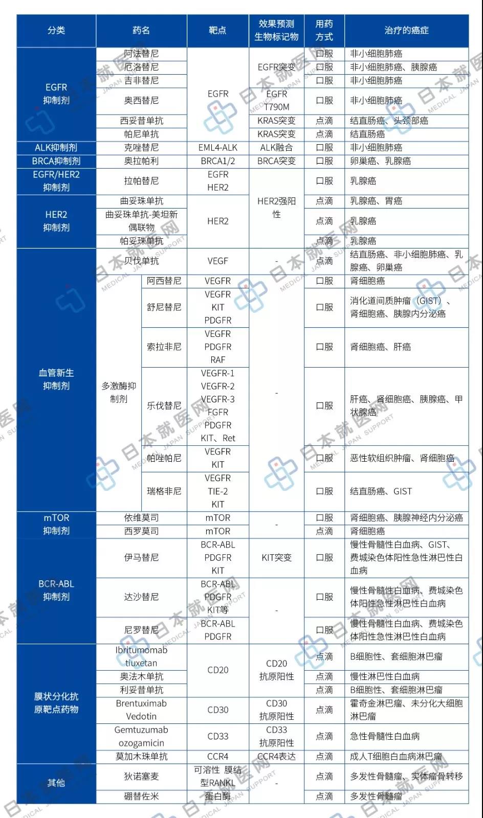 按照靶點(diǎn)的分子可分為EGFR抑制劑、ALK抑制劑、HER2抑制劑、血管新生抑制劑、mTOR抑制劑、BCR-ABL抑制劑、膜狀分化抗原靶向藥物等。