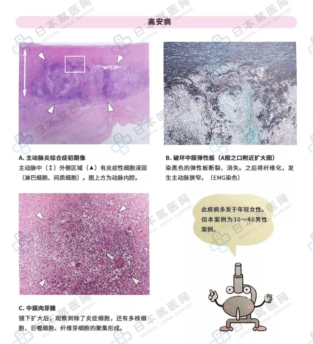 主動(dòng)脈炎綜合征又稱高安病,是一種原因不明的血管炎,主動(dòng)脈或主動(dòng)脈分支大血管炎癥,造成血管狹窄、閉塞,損傷心、腦、腎。多數(shù)在感冒后發(fā)病,可能是某種病毒的感染引起,因?yàn)榛颊叨酁榕裕酝茰y(cè)其與女性荷爾蒙的分泌程度有關(guān)。在血管組織中,動(dòng)脈中模發(fā)生慢性炎癥后使之纖維化,最終造成血管內(nèi)腔狹窄。圖二是初期像,中模形成肉芽腫樣炎癥。