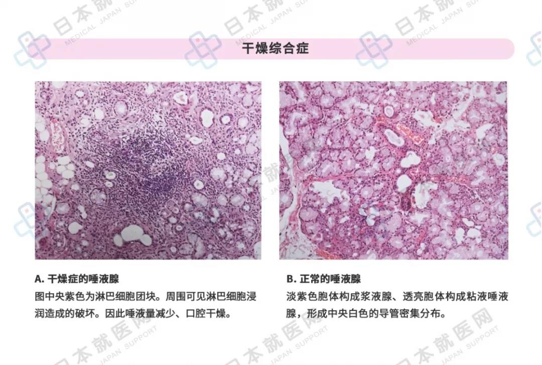 淚腺損傷后發(fā)生干眼癥,唾液腺損傷后口腔干燥都是干燥癥的癥狀。進(jìn)一步,淚腺和唾液腺之外的外分泌腺也會(huì)發(fā)生慢性炎癥。該病可以檢測(cè)出類風(fēng)濕因子或核蛋白,同時(shí)與其他自勉病合并發(fā)生的也很多。干燥癥的具體病因不明,推測(cè)與B細(xì)胞的活性過(guò)強(qiáng)有關(guān)。
