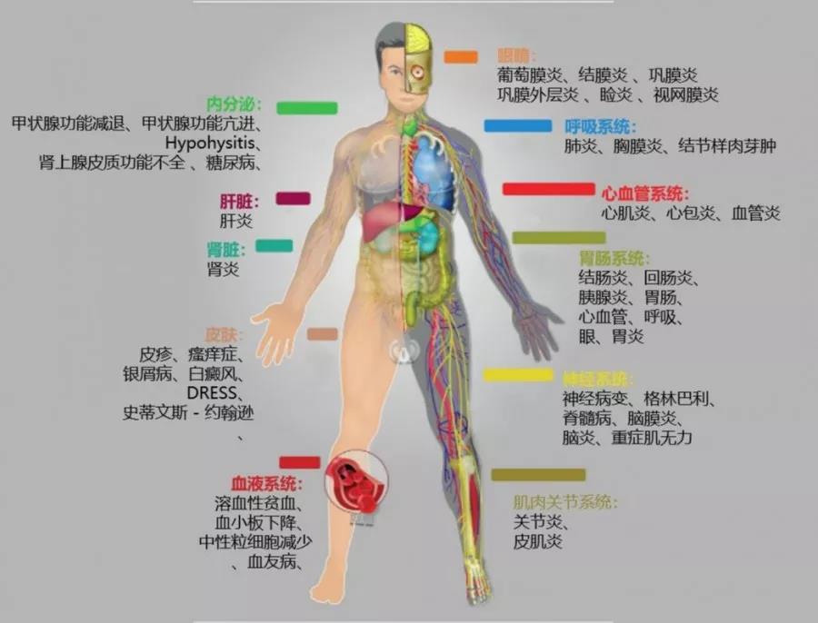 PD1所引起的副作用,我們通常稱之為免疫相關不良反應(irAEs),它的產生是因為免疫抑制劑獨特的作用機制,因免疫活性的增加或免疫過度激活所產生。人體的免疫系統遍布全身,因此其不良反應也涉及到諸多人體重要器官。