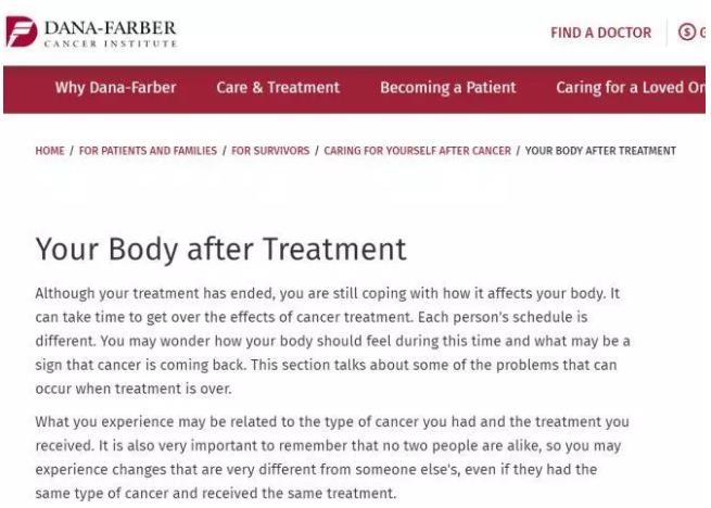 丹納法伯癌癥中心和美國各大癌癥中心都會在網站上為患者和患者看護人準備癌癥治療前后需要的注意事項、身體會發生的變化、可預料到的副作用、如何通過飲食來緩解不適等。