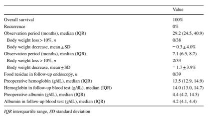 在29.2個月的中位隨訪期內(nèi),所有患者均生存、無復(fù)發(fā)(表2)。平均體重減輕率為0.3±4.0%,沒有患者體重減輕超過術(shù)前體重的10%。在隨訪內(nèi)窺鏡檢查中,未報告食物殘渣。