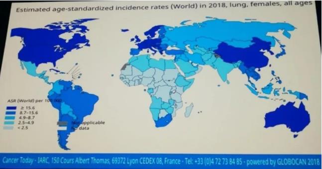 上面這張圖顯示的是IARC估測(cè)的2018年女性的肺癌發(fā)生率,顏色越深代表發(fā)生率越高。可以看到,中國(guó)女性肺癌發(fā)生率與北美、北歐、西歐和澳大利亞一樣,是最深的一檔,也就是女性肺癌發(fā)生率最高的地區(qū)。與中國(guó)同在東亞的日本則發(fā)生率比中國(guó)稍微低一些,考慮到日本的老齡化問題、同樣的女性低吸煙率和人種的接近性,這個(gè)差異令人深思……