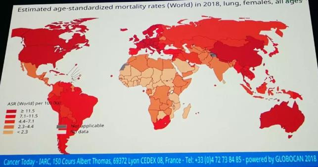 在肺癌死亡率方面,中國(guó)不幸的處于最高一檔。上圖中顯示的是IARC估測(cè)的2018年全球各地女性肺癌的死亡率,顏色越深代表死亡率越高。