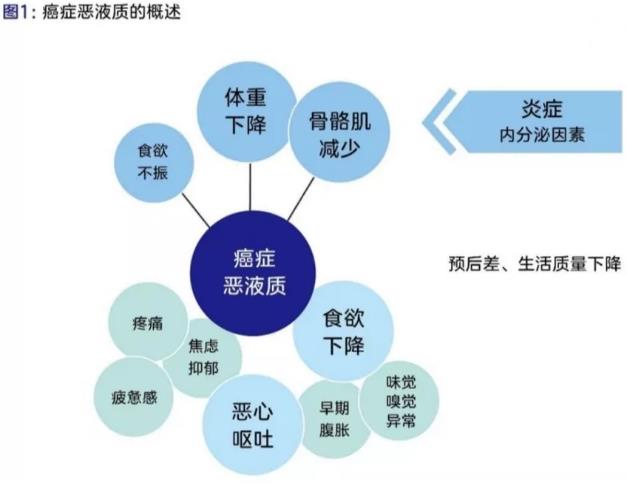 癌癥惡液質的典型癥狀表現為:體重減輕,骨骼肌質量減少和食欲不振,并伴有疲勞,疼痛,焦慮和抑郁。惡液質進一步加重后,抗癌藥物的療效降低,副作用增加,不得不中斷抗癌治療(圖1)。惡液質及其發(fā)展都影響患者的生活質量和預后。任何種類的癌癥都有可能并發(fā)惡液質,其中胃癌、大腸癌、胰腺癌的發(fā)癥頻率最高。