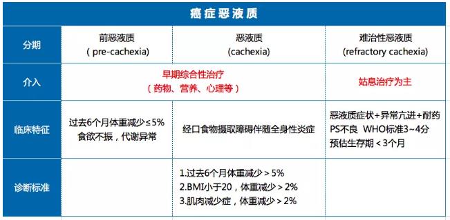 該指南將惡液質分為三個階段:“前惡液質”,“惡液質”和“難治性惡液質”,并提倡以下診斷標準。