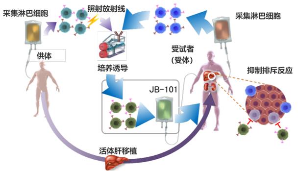 此次臨床試驗征得患者同意后將在實施肝移植前的觀察期進行篩查,以確認是否適合參加臨床試驗,然后利用單采術(Apheresis)在實施肝移植的14天前~3天前從供體、在實施肝移植的前一天從受試者體內采集外周血單核細胞。將從供體和受試者體內采集的白細胞中的單核細胞與CD80/CD86抗體(激活T細胞的分子)進行共培養,培養的單核細胞會轉化成保護供體組織免受排斥的細胞(誘導型抑制性T細胞“JB-101”)。