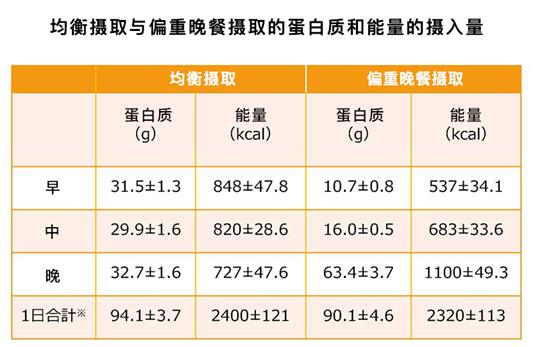 下面的圖表顯示了在每日攝取等量蛋白質的情況下,一日三餐“均衡攝取” 和“偏重晚餐攝取”的肌肉合成率比較結果。兩種情況下一日三餐每餐的蛋白質攝入量如圖所示: