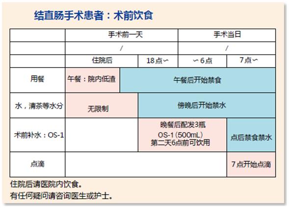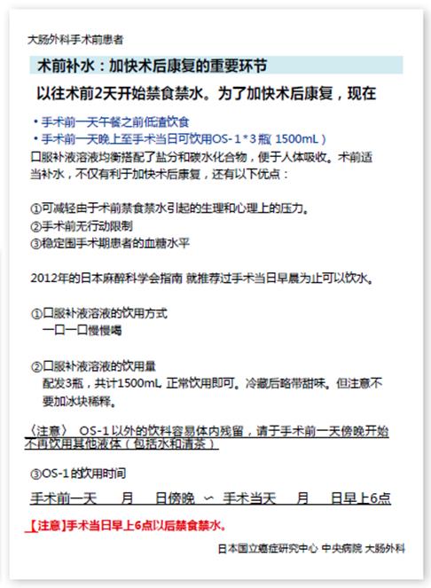 日本國(guó)立癌癥研究中心中央病院的大腸外科手術(shù)患者一直到手術(shù)前一天的午餐為止可以低渣飲食,從前一天的晚上18點(diǎn)以后到手術(shù)當(dāng)天早上6點(diǎn),可飲用口服補(bǔ)水補(bǔ)液「OS-1」1,500mL。