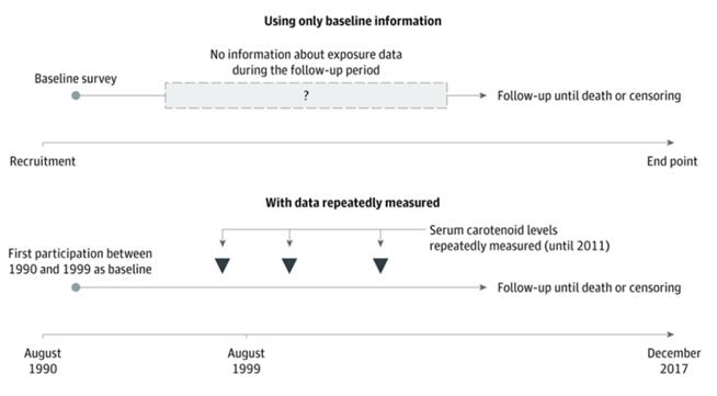 盡管有大量前瞻性研究顯示,血清中的類胡蘿卜素水平與全因死亡率相關(guān)。然而,大多數(shù)研究未考慮長(zhǎng)期血清中的類胡蘿卜素水平的變化對(duì)健康的影響。類胡蘿卜素在血液中的濃度往往受日常飲食影響,要明確類胡蘿卜素與死亡風(fēng)險(xiǎn)之間的關(guān)聯(lián)就需進(jìn)行長(zhǎng)期的跟蹤測(cè)量。