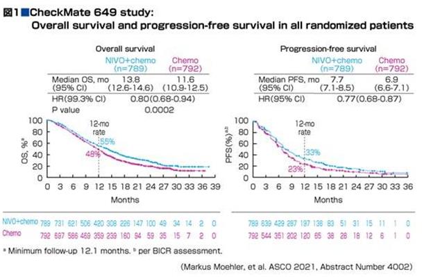 在今年6月舉行的美國臨床腫瘤學會(ASCO 2021)在線會議上,一項名為CheckMate-649的3期研究成果顯示,在一線治療非HER2陽性的晚期胃癌、胃食管交界處癌和食管腺癌中,與單獨化療相比,抗PD-1抗體納武單抗(O藥)聯合化療延長了總生存期(OS)和無進展生存期(PFS)。