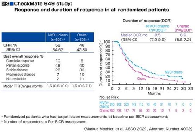 客觀緩解率(ORR)上來看,全部患者人群中,納武單抗+化療組58%,單獨化療組在46%;完全緩解率(CR)分別為10%和6%(圖3)。中位緩解持續時間(DOR)上,納武單抗+化療組為8.5個月,單獨化療組6.9個月。CPS≥5患者中,納武單抗+化療組的客觀緩解率60%,完全緩解率在12%,而單獨化療組客觀緩解率45%,完全緩解率在7%,中位緩解持續時間,納武單抗+化療組9.5個月,單獨化療組7個月;