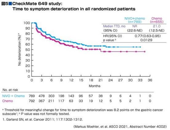 納武單抗+化療組在延緩癥狀加重的時間上顯示出了優勢(圖5),這也是提高患者生活質量的一個證明。腫瘤縮小患者,后續治療效果會持續,延緩進展時間。因此,即使2組的OS相同,時間最久的一線治療中,納武單抗+化療組在減少癥狀發生方面有顯著優勢,能夠長期保持較高的生活質量。胃癌治療指南指出,不可切除,晚期或復發胃癌的治療目標之一就是,改善與病情進展相關的臨床癥狀并延遲癥狀的發生。