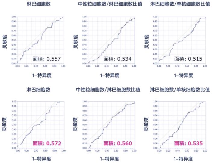 研究團(tuán)隊(duì)在此基礎(chǔ)上進(jìn)一步驗(yàn)證了irAE與末梢血細(xì)胞數(shù)量的關(guān)聯(lián)性。通過(guò)對(duì)比Opdivo治療前(圖-上)與治療2周后(圖-下)的受試者工作特征曲線(ROS),發(fā)現(xiàn)治療2周后的ROS曲線下面積相比治療前稍大。ROS曲線顯示,Opdivo治療開始2周后的淋巴細(xì)胞數(shù)、中性粒細(xì)胞數(shù)/淋巴細(xì)胞數(shù)比值、淋巴細(xì)胞數(shù)/單核細(xì)胞數(shù)的臨界值(cutoff value)分別為820(單位:cells/mm3)、4.3和2.2。
