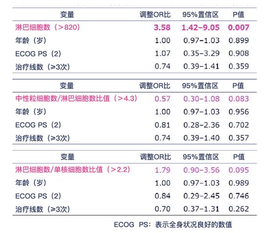 邏輯回歸分析(Logistic Regression, LR)的結(jié)果顯示,淋巴細(xì)胞計(jì)數(shù)大于820(單位:cells/mm3)時(shí)與irAE存在顯著關(guān)聯(lián)(表2-頂部)。另一方面,中性粒細(xì)胞計(jì)數(shù)/淋巴細(xì)胞計(jì)數(shù)比率與淋巴細(xì)胞計(jì)數(shù)/單核細(xì)胞計(jì)數(shù)比率之間沒有發(fā)現(xiàn)顯著相關(guān)性(表2-中,底部)。