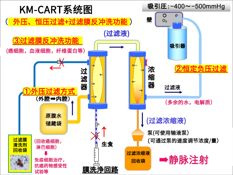 癌癥晚期或肝硬化的患者往往會出現大量腹水,這可能導致無法繼續進行抗癌藥物治療。直到現在,腹水仍然沒有得到積極的治療,因為人們普遍認為“引流腹水會讓患者更加虛弱”,“一次性引流過多腹水會危及生命”。 而日本東京要町醫院腹水治療中心主任-松崎圭介推翻了這一觀點。他開發的KM(Keisuke Matsusaki)-CART(腹水過濾濃縮回收)系統自2009年至今已經治療了9000多例腹水患者。