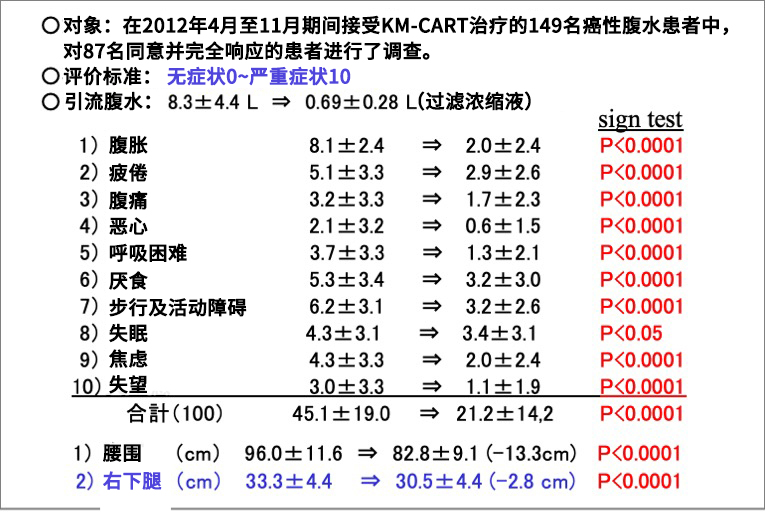 使用KM-CART系統治療腹水后,許多患者的全身狀態得到了改善,能夠恢復抗癌藥物治療,還有許多患者的腫瘤標志物也得到了改善。可以說;KM-CART系統確確實實地幫助到腹水患者緩解癥狀,恢復抗癌治療。