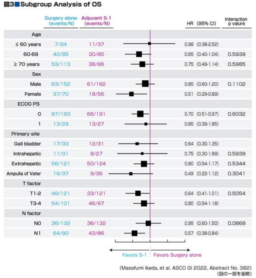 在實驗對象的亞組分析中為發現S-1無效群體。S-1起效與膽囊、肝外膽管、肝內膽管、壺腹部的部位也沒有關系,不同原發部位也都獲得了療效。