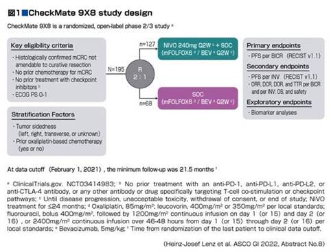 CheckMate 9X8 試驗(yàn)將受試者隨機(jī)分為四組:未接受化療,未接受免疫檢查點(diǎn)抑制劑治療,接受納武利尤單抗+標(biāo)準(zhǔn)治療(mFOLFOX6 + 貝伐單抗),僅接受標(biāo)準(zhǔn)治療(圖 1)。