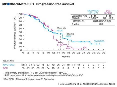 mFOLFOX6+貝伐單抗的一線治療時加入納武利尤單抗,并沒有顯著延長無進(jìn)展生存期(PFS)。