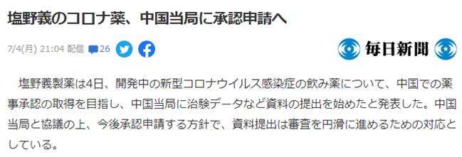 根據(jù)日本新聞報道,日本鹽野義制藥公司近日發(fā)布消息稱,關(guān)于正在研發(fā)的新冠病毒治療藥,已經(jīng)向中國監(jiān)管機(jī)構(gòu)提... -